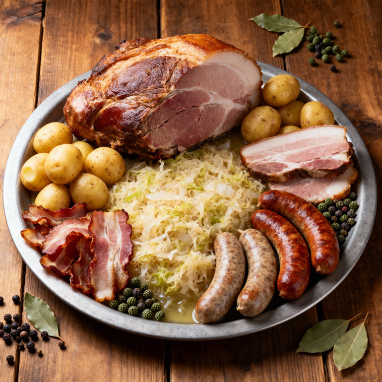 Place the sauerkraut in a large pot with the onion, garlic, bay leaves, juniper berries, and white wine, then add the smoked bacon or pork belly. Cover and simmer gently so the flavours blend and the sauerkraut softens without losing texture. Cook the potatoes separately until tender. Add the sausages during the final part of the cooking process so they warm through without splitting. Adjust seasoning, arrange the meats and potatoes over the sauerkraut, and serve the dish piping hot in true Alsatian style.